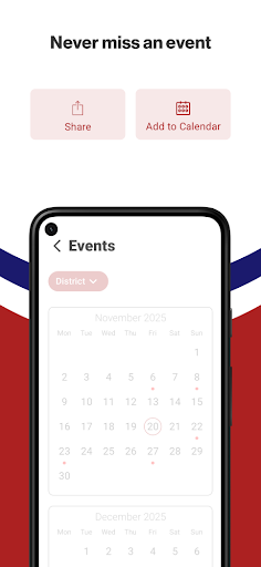 The event section shows a list of events throughout the district. Users can add an event to their calendar and share the event with friends and family with one tap.