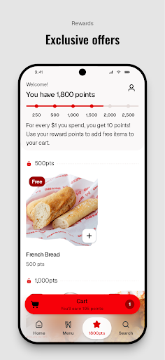 - Earn free food with rewards points.