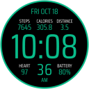Designed for clarity and quick access to essential information, the face prominently displays the current time, date, and your key fitness stats: Steps, Calories, Distance, Heart Rate, and Battery percentage. Personalize the look to match your style with a massive selection of 30 vibrant color variations, and enhance the aesthetic further by adding a dynamic gradient effect to the overall design. For global users, the static texts (such as the day of the week) are available in 10 different language variants. The time display supports both 12-hour and 24-hour modes, while the distance metric automatically switches between kilometers and miles based on whether your watch is set to display temperature in Celsius or Fahrenheit, respectively.This watch face offers unparalleled control over what you see. You have the flexibility to hide all five displayed data points separately and replace them with standard circular complications of your choice, allowing you to integrate data from other apps directly onto the screen. Furthermore, you can choose to hide the prominent outer ring on both the normal active view and the Always-On Display (AOD) view for a cleaner, minimalist look. Please note that for accuracy, the calories burned and distance traveled are estimations based solely on your step count, as the watch face itself does not have direct access to your watch's native calorie or GPS distance data points.