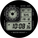 This watch face captures the essence of a legendary digital tool watch, delivering a rugged "command center" aesthetic to your wrist. The high-density layout features a prominent digital clock alongside dedicated readouts for heart rate, battery life, and step counts. With its professional, mission-ready design and iconic segmented compartments, it brings a timeless, technical look to your modern smartwatch.Personalization is at the heart of the experience, offering 8 camo background options, 10 LCD color options, and 9 LCD gradient options. This vast array of choices allows you to create a unique look that matches your tactical gear or daily style. To further refine your setup, you can hide the analog dual-time display to insert a circular complication in its place, giving you the freedom to prioritize the specific data you need most.