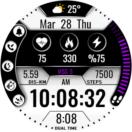 Dial Features: Different color options-Alarm-Phone-Sleep-Timer-Stress-Km-Steps-Message-Date-Pulse-Kcals-Power-Dual Time-Weather complications-Digital Clock-Aod-Am-Pm-For Wear OS