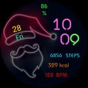 A modern neon digital watch face for WearOs devices. Pars Christmas Santa Claus is compatible with all watches using Wear OS SDK 34 and Api 34+.